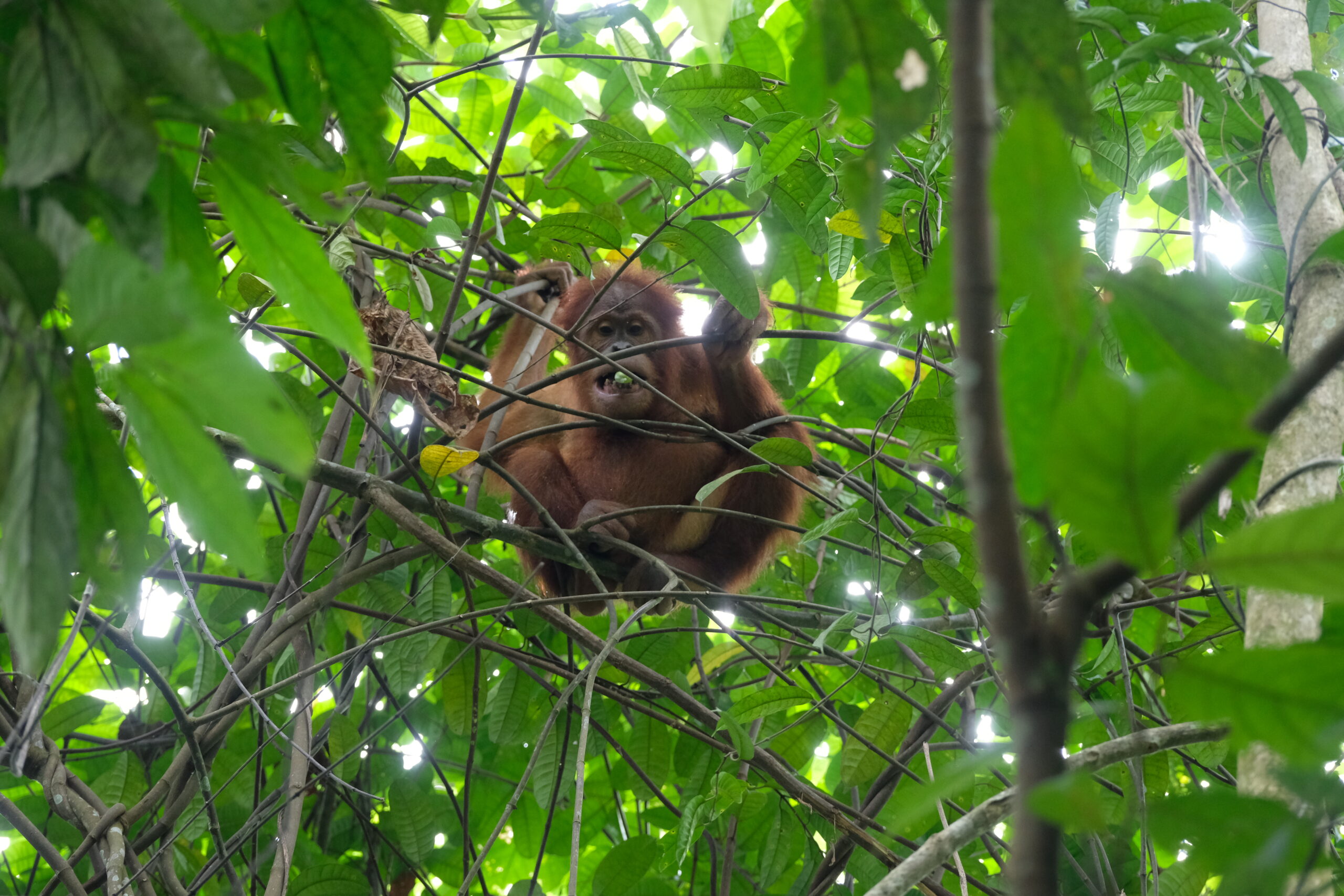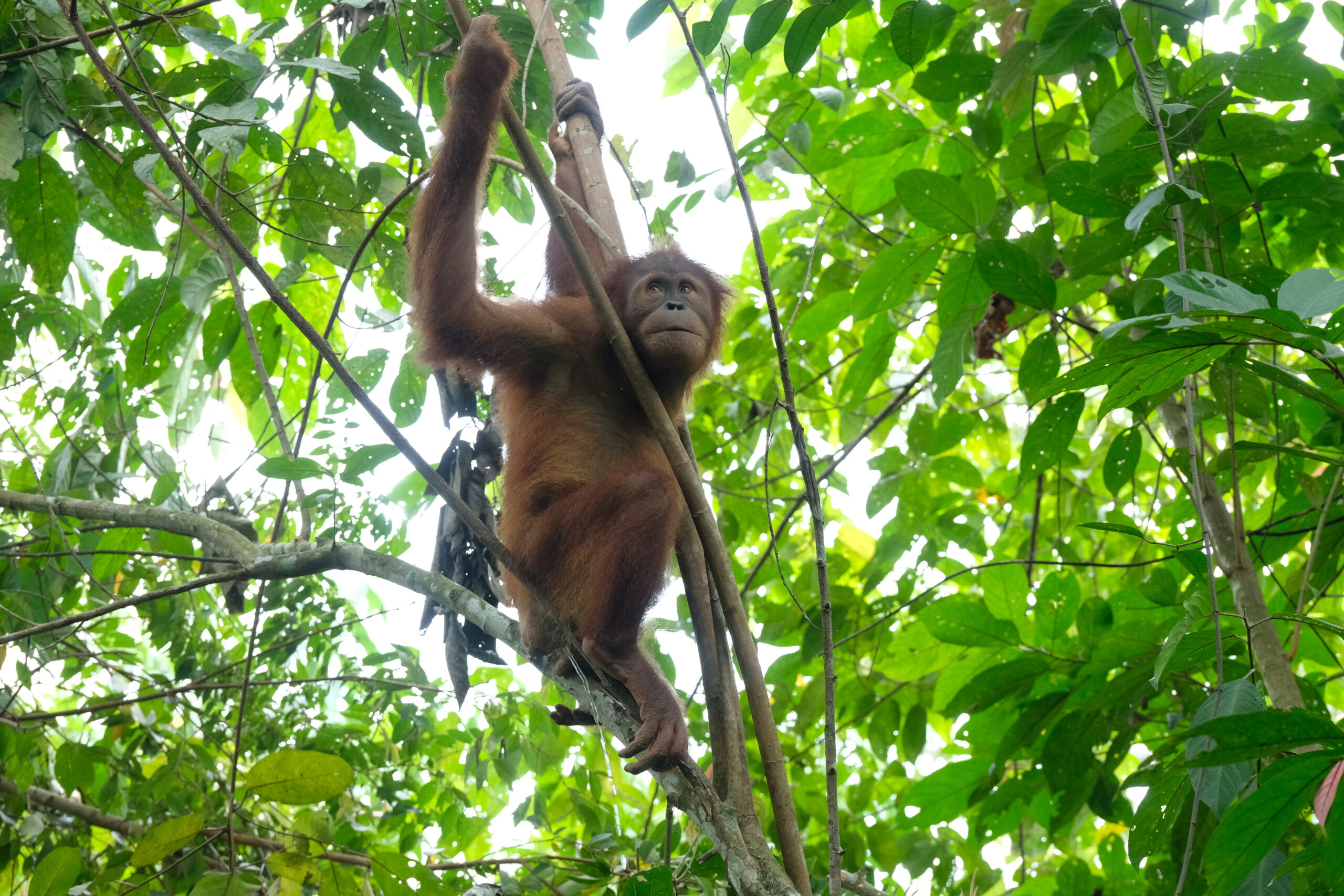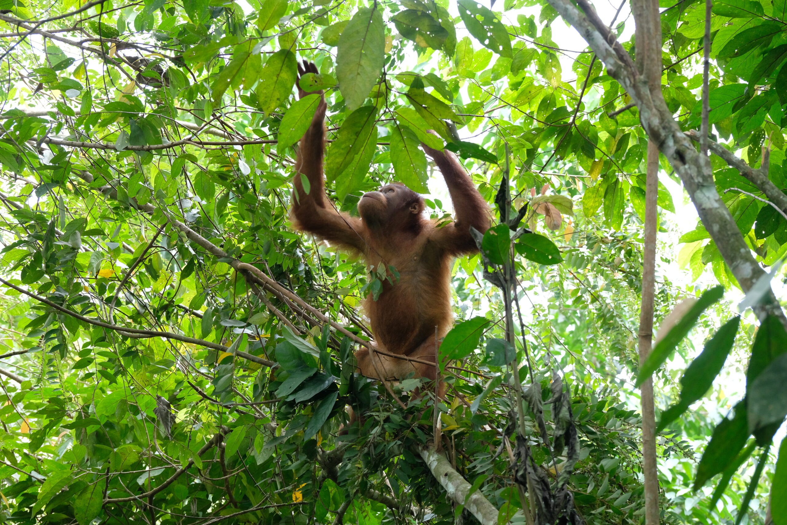 On her first return to Forest School Janet closely followed the activities of two other orangutans, Rapala and Matang. Initially, they played and foraged in the trees. Then Janet the two orangutans down from the trees and spent time playing on the ground until the Forest School session ended and it was time to return to the enclosure.