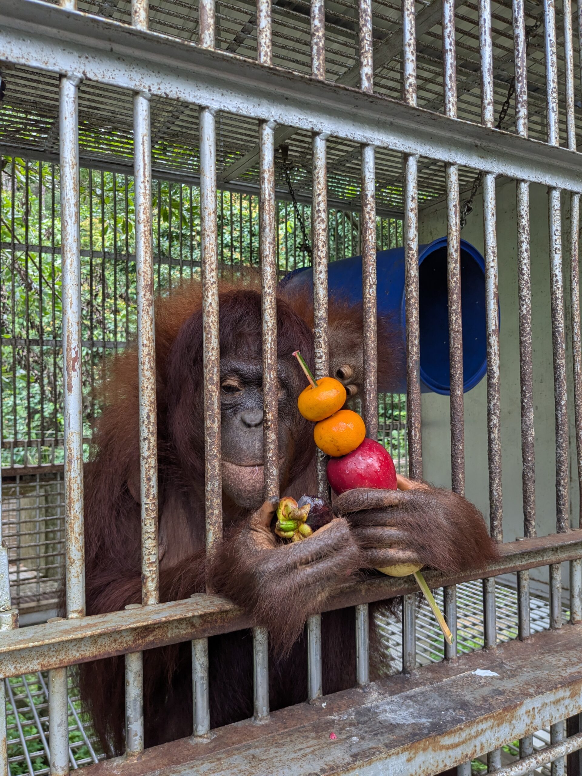 Sinta herself now spends much of her time on the cage floor, sitting or resting while maintaining watch from a distance. Sabine, on the other hand, appears increasingly active and confident. She hangs from the cage structures, climbs, and plays with a drum provided as part of daily enrichment. These activities play a crucial role in strengthening muscles, improving balance and coordination, and stimulating curiosity and exploratory behavior—essential skills for young orangutans undergoing rehabilitation.